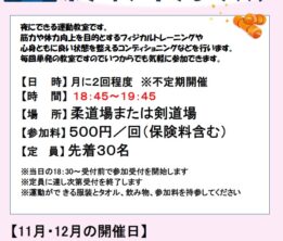 心身ともに良い状態を整えるコンディショニングなどを行います。 毎回単発の教室ですのでいつからでも気軽に参加で...