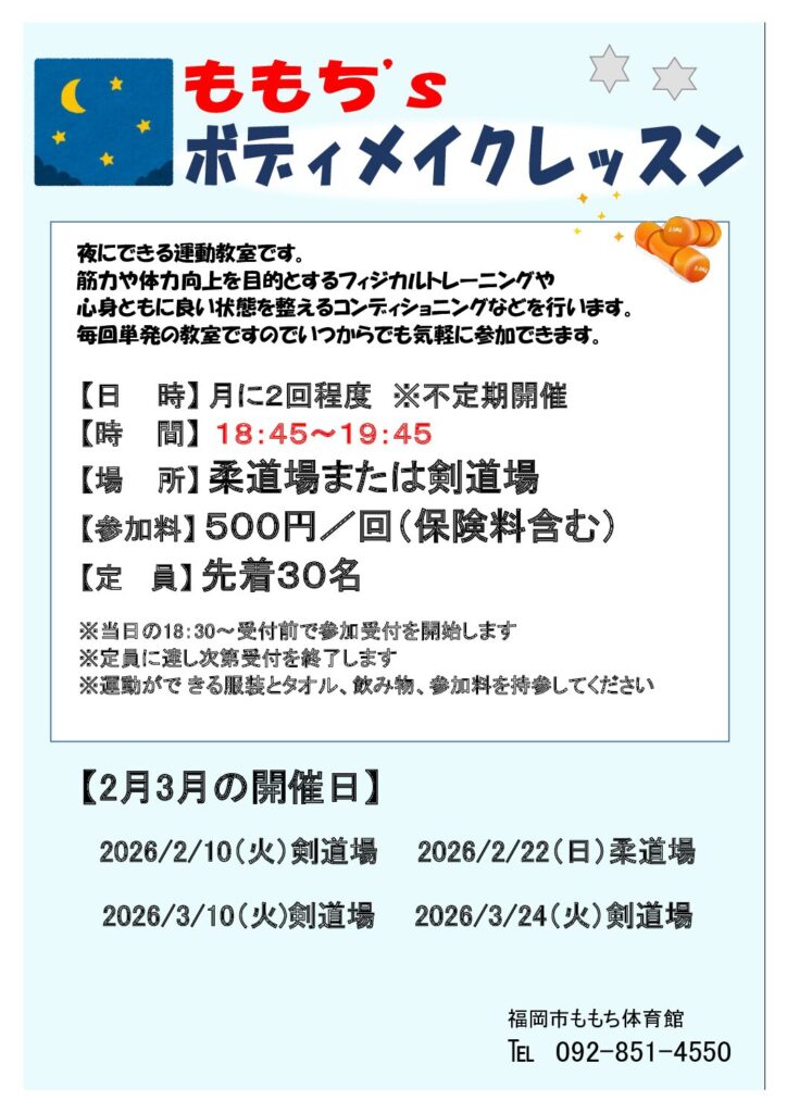 心身ともに良い状態を整えるコンディショニングなどを行います。 毎回単発の教室ですのでいつからでも気軽に参加できます。